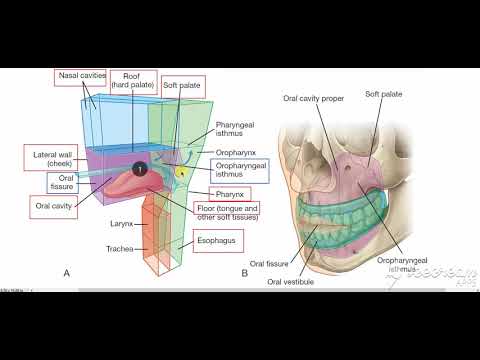 The oral cavity spans between the oral fissure (anteriorly – the opening between the lips), and the oropharyngeal isthmus (posteriorly – the opening of the oropharynx).